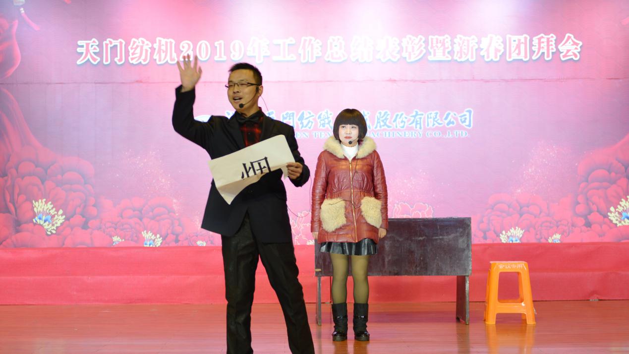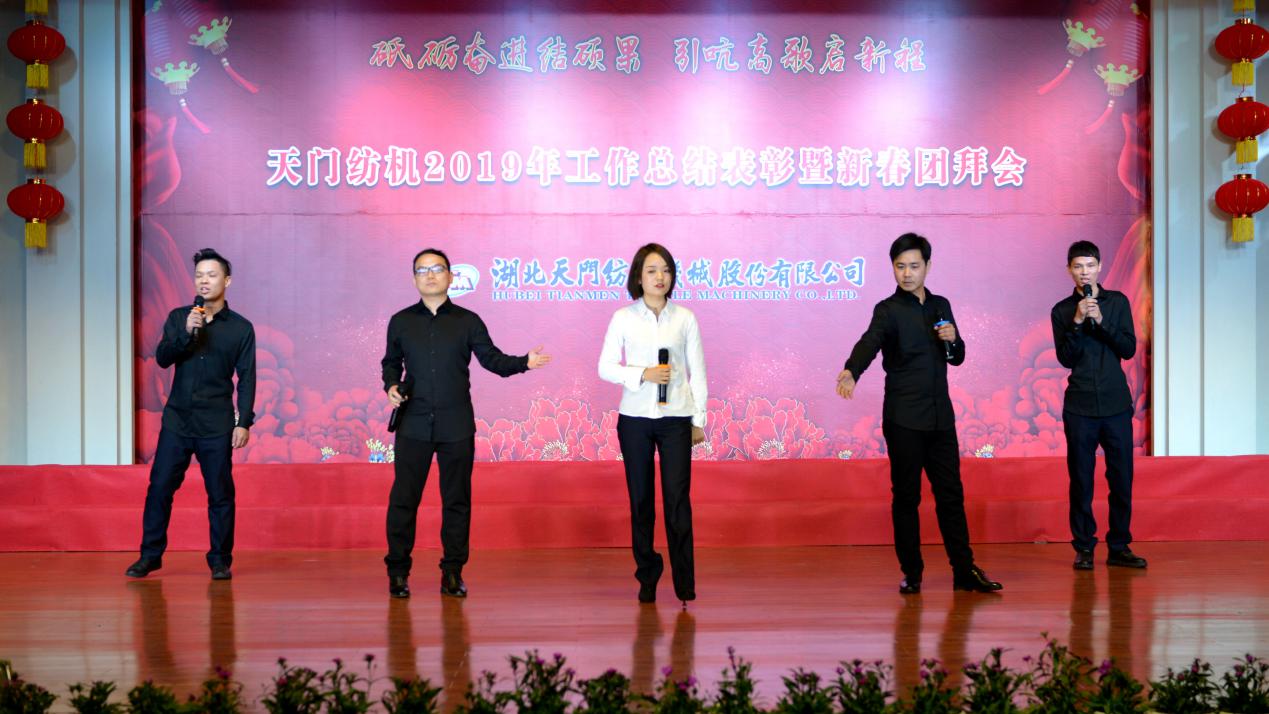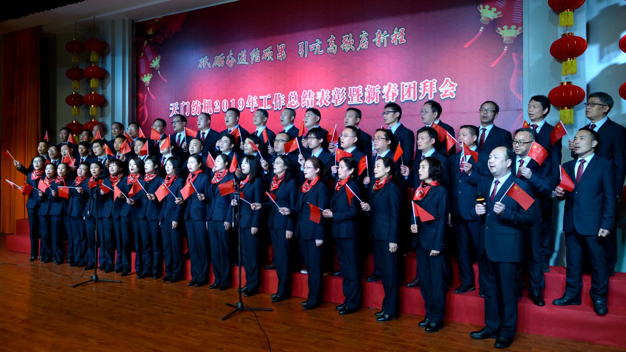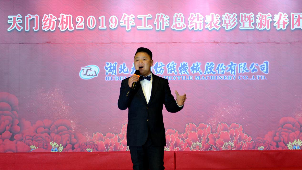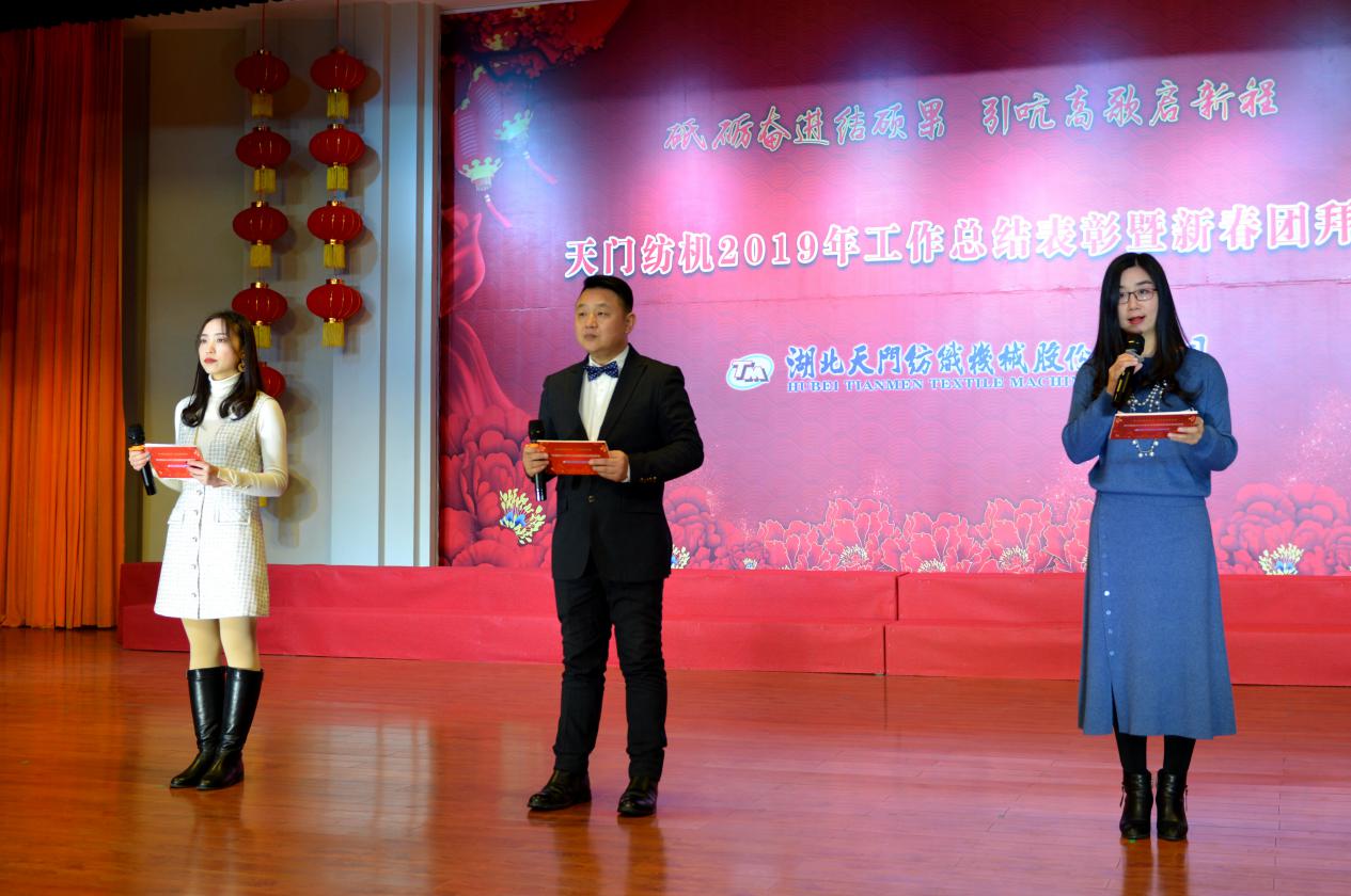 2020年1月21日下午,湖北天門紡織機(jī)械股份有限公司綜合樓多功能廳張燈結(jié)彩、暖流融融,一場主題為“砥礪奮進(jìn)結(jié)碩果、引吭高歌啟新程”的年度總結(jié)表彰暨新春團(tuán)拜會(huì)在這里舉行,400多名員工身著公司新佩發(fā)的西服套裝,精神奕奕地走進(jìn)會(huì)場。13:00整,三位主持人靚妝登場,宣布2019年度總結(jié)表彰暨新春團(tuán)拜會(huì)開始。