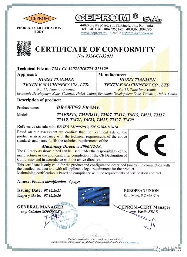 產品得到國際市場認可,天門紡機獲得歐盟“CE”證書