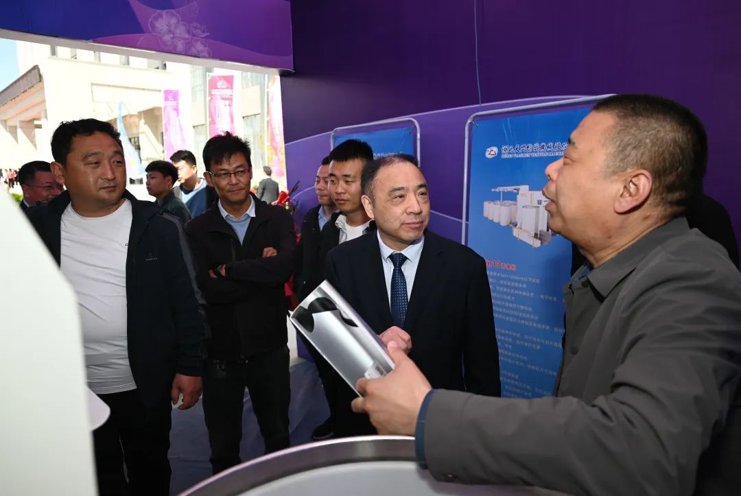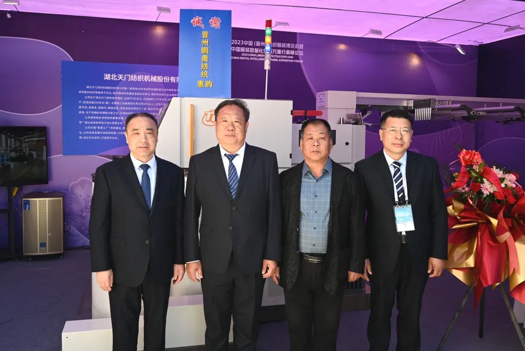 天門紡機(jī)總經(jīng)理焦倫進(jìn)向蒞臨公司展位的晉州市長王林(右2)、中國服裝協(xié)會(huì)常務(wù)副會(huì)長楊金純(右1)、晉州市紡織服裝行業(yè)協(xié)會(huì)會(huì)長李永強(qiáng)(左1)介紹公司與晉州紡織企業(yè)合作情況