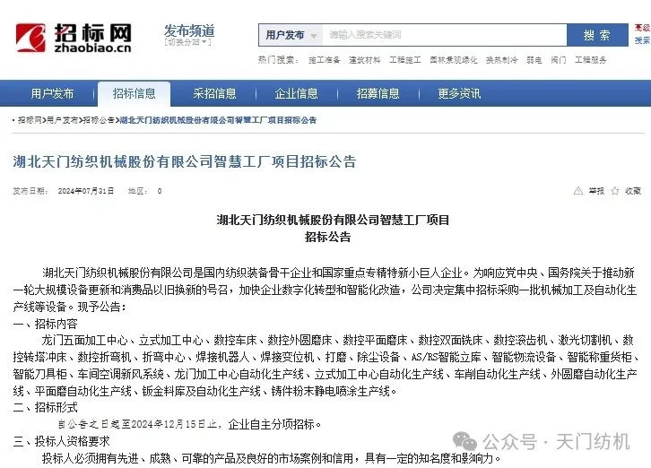 近日,天門紡機對外發布設備招標公告,正式啟動“智慧工廠”項目新一輪設備采購計劃。