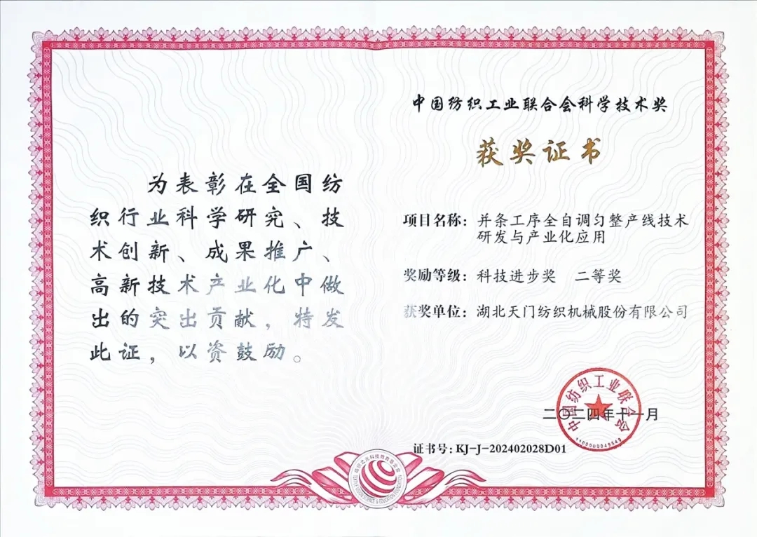 2024年11月12日,在北京人民大會堂召開的2024年度中國紡織工業(yè)聯(lián)合會科學(xué)技術(shù)獎勵大會傳來喜訊,由天門紡機(jī)主導(dǎo),武漢紡織大學(xué)、安徽華茂紡織股份有限公司、武漢銀橋南海光電有限公司等單位合作開發(fā)的“并條工序全自調(diào)勻整產(chǎn)線技術(shù)研發(fā)與產(chǎn)業(yè)化應(yīng)用項目”獲得2024年“中國紡織工業(yè)聯(lián)合會科學(xué)技術(shù)獎”科技進(jìn)步二等獎。